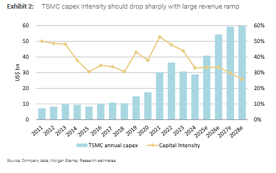 值得能干的是,台积电的本钱密集度估量将跟着营收大幅增长而大幅下落。尽管2026年本钱支拨鼎新高,但跟着产能在2027-2028年开释,本钱支拨占营收比例将权臣镌汰。
