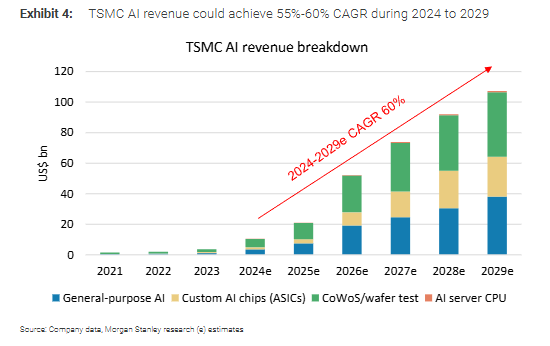 台积电上调AI半导体营收增长预期,从45%普及至55-59%的复合年增长率(2024-2029年),接近摩根士丹利60%的预测。