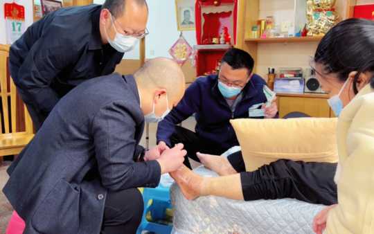“王主任,你们竟然来了!太辛劳你们了!”文奶奶又惊又喜。王雪萍照看长因地制宜的准备好操作区域,王林主任则再次密致地为文奶奶进行了康复评估,查验了下肢活动、伤口愈合及全身情况。