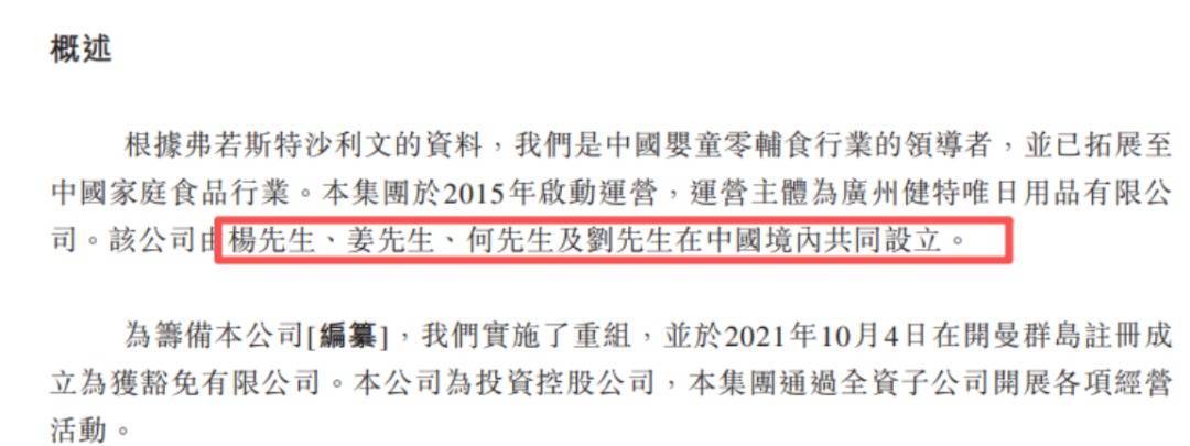 而在招股书中,公司暗意,爷爷的农场是2015年由杨钢、姜福全、何建农、刘海波四名中国籍独创东说念主在中国境内共同树立。中枢主体为广州健特唯日用品有限公司,四东说念主皆有威莱日化从业配景,无食物行业深耕陶冶,IPO前四东说念主系数捏股100%,完结都备控股。