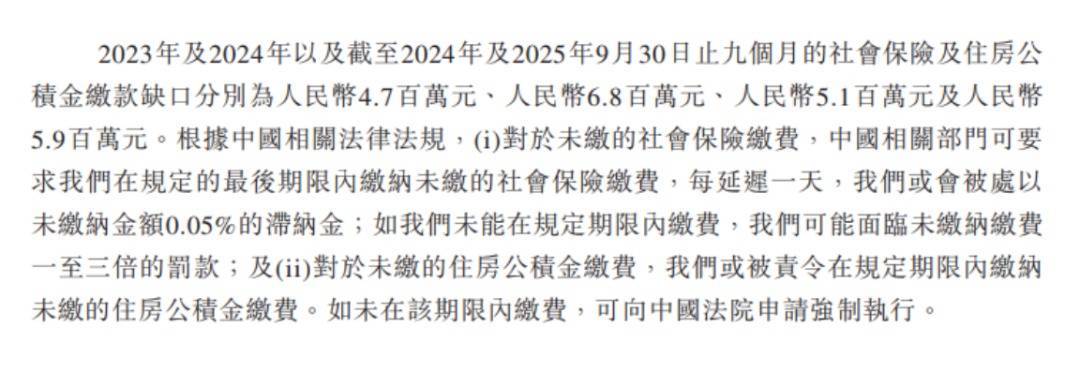 2024年公司向独创东说念主鼓动分红750万元,2025年前三季度豪分6300万元,后者占当期利润比例达72.07%。同期,招股书明确自大,2023年、2024年及2025年前三季度,公司社会保障及住房公积金缴款缺口分辩为470万元、680万元及590万元,不到三年内累计欠缴金额高达1740万元,且欠缴缺口呈逐年扩大态势。